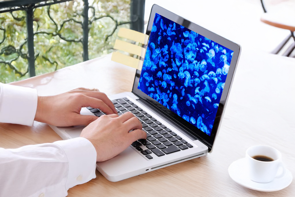 説明:【画像のはめ込み合成】背景とテーブル、コーヒーカップは生成AIにて作成。PCディスプレイに画像をはめ込み合成